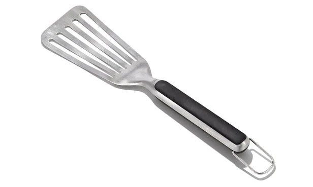 Whether you’re grilling salmon filets, thick-cut pork chops, or juicy burgers, this grilling precision turner is perfect. The thin, beveled head slides right under food, while the sturdy stainless steel construction provides support for fumble-free flipping and transferring. Features a comfortable, non-slip grip and a convenient hanging ring for grill-side storage. Dishwasher safe.