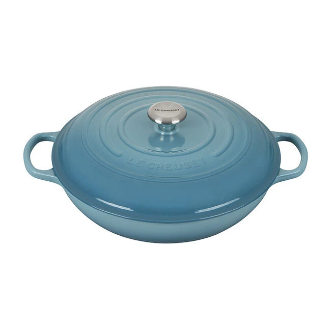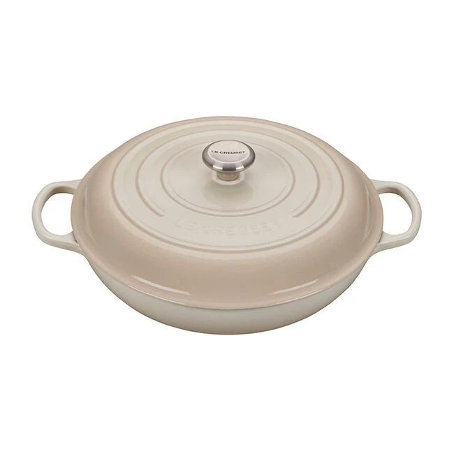 The Le Creuset enameled cast iron Braiser is uniquely designed to provide steady, even heat to transform tough cuts of meat and hearty vegetables into tender, flavorful dishes. The wide base allows ingredients to be placed in a single layer for searing without crowding; once liquid is added, the domed lid circulates steam to lock in moisture and flavor. The versatile shape of the braiser also makes it perfect for shallow frying, steaming, stews, casseroles and serving at the table.