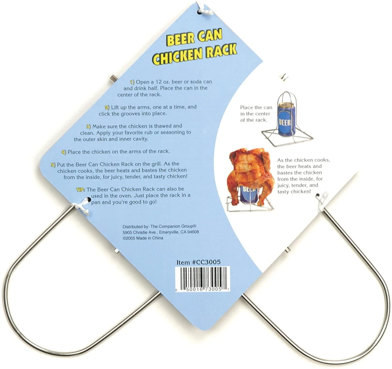 With the Charcoal Companion Stainless Beer Can Chicken Rack it couldn’t be simpler. Place open beer can in center of rack, raise the two arms up to hold the can in place and place chicken over the rack and can. Perforated bottom allows heat direct from the grill. As the chicken grills the liquid steams the poultry from the inside out. You can use any liquid in a soda or beer can: beer, wine, fruit juice or your favorite basting recipe.