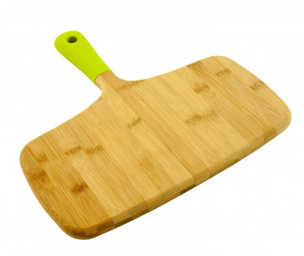 This durable bamboo cutting board is a beautiful and practical addition to your indoor or outdoor kitchen. Use during food prep to chop and cut your food without damaging countertops. Even better, the colorful soft-grip handle makes it easy to transport to the table to use for serving.