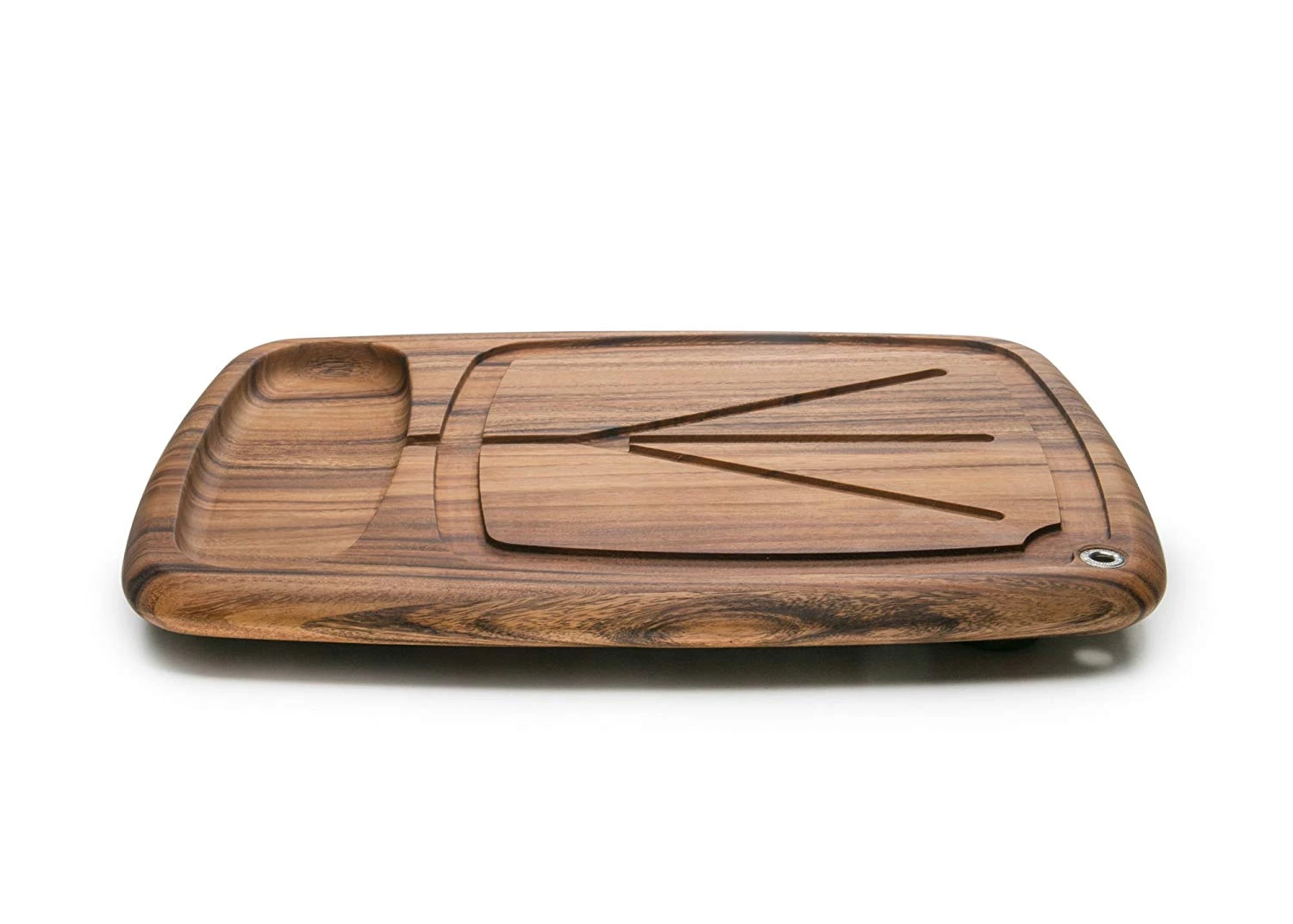 Slopes to the right so excess juices are collected in the pool, where you can place your slices to keep them moist