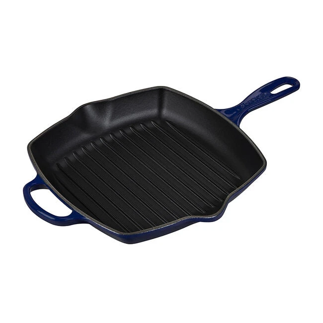 The Square Skillet Grill’s interior is coated with Le Creuset’s protective satin black finish to prevent damage and wear. Over time, this slightly abrasive interior develops a natural patina that is ideal for searing and frying.