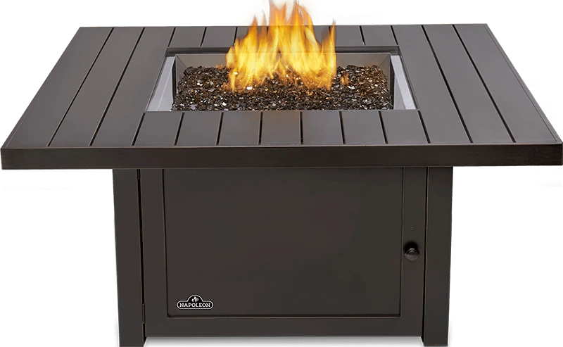 This is the focal point of your relaxation area. The Napoleon St. Tropez Square Patioflame® Table boasts a design that is both elegant and modern, it will match any decor. Finished in rustic bronze and paired with a glass ember bed, provides for a stunning look. It even comes with an aluminum burner cover to turn it into a full table when you’re not watching those beautiful flames. Easily light the Square Patioflame® Table and receive 60,000 BTU’s of heat, dancing flames, and glittering light for your outdoor space. No need to worry about unsightly fuel lines and tanks cluttering your space. The St. Tropez Patioflame® Table hides the propane tank behind an easy access door.