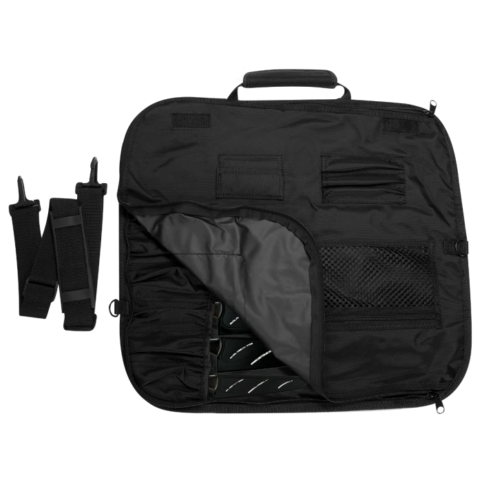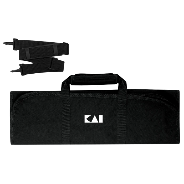 The Kai 8-Slot Knife Roll offers space for up to eight knives in secure elasticized pockets. There’s also a zippered net pocket inside, perfect for non-bladed kitchen tools. The interior of the knife roll has space for business cards, writing tools, or chopsticks. The roll is made of PVC-laminated 600 denier woven polyester with nylon straps. It is fully zippered, has Velcro closures, and offers a padded, reinforced handle when it’s time to travel.