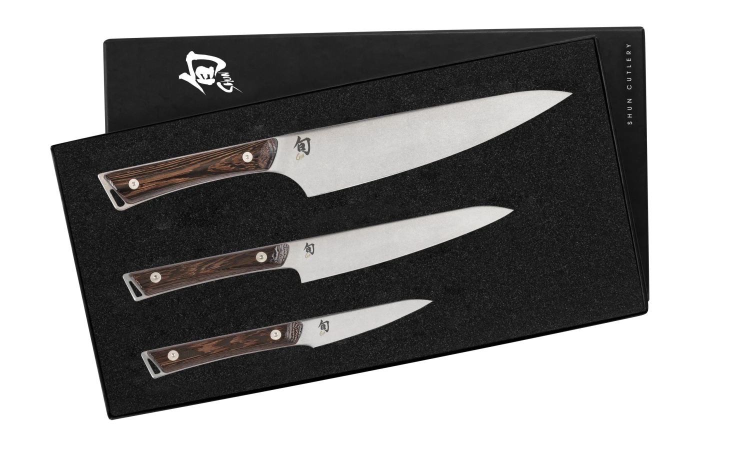 The Shun Kanso 3-Piece Starter Set includes three of the most vital pieces of kitchen cutlery. The set is built around the Shun Kanso 8-in. Chef’s Knife, the one knife you’re sure to use every time you cook. On the other end of the scale is the Shun Kanso Paring Knife, ideal for all those trimming and peeling tasks. This beautiful set also includes the Shun Kanso 6-in. Utility Knife—perfect for in-between-sized tasks. This attractive set comes in a tasteful box suitable for storage or gift-giving.
