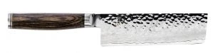 The Shun Premier Nakiri is part of the beautiful Shun Premier line, which calls to mind the hand-forged knives of ancient Japan. While each knife still takes at least 100 handcrafted steps to complete, the materials Shun uses are among the most advanced in the industry. Each blade has a cutting core of Shun’s proprietary VG-MAX “super steel” to take and hold a precision edge. The layered Damascus cladding supports the core and provides additional stain resistance. Near the edge of the blade, where the steels meet, an undulating line is formed—similar to the hamon formed when samurai swords are tempered using a traditional clay-baking technique. The hammered tsuchime finish acts like a series of hollow-ground cavities to reduce drag. The handles nestle comfortably in the hand, while the embossed end cap adds balance and beauty.