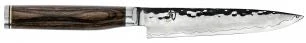 The Shun Premier Steak Knife is part of the beautiful Shun Premier line, which calls to mind the hand-forged knives of ancient Japan. While each knife still takes at least 100 handcrafted steps to complete, the materials Shun uses are among the most advanced in the industry. Each blade has a cutting core of Shun’s proprietary VG-MAX “super steel” to take and hold a precision edge. The layered Damascus cladding supports the core and provides additional stain resistance. Near the edge of the blade, where the steels meet, an undulating line is formed—similar to the hamon formed when samurai swords are tempered using a traditional clay-baking technique. The hammered tsuchime finish acts like a series of hollow-ground cavities to reduce drag. The handles nestle comfortably in the hand, while the embossed end cap adds balance and beauty.