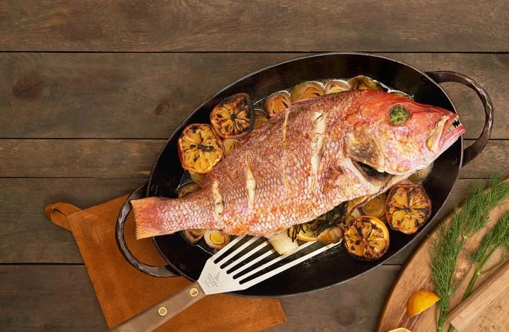 Inspired by American blacksmith design of the 18th and 19th century, this new carbon steel farmhouse oval roaster is designed in collaboration with renowned Charleston artisan and blacksmith Robert Thomas. Hand-forged and limited in quantity, each oval roaster is visually unique while sharing fundamental design elements including hand hammered handles with a texture designed for easy gripping and a beautiful pre-seasoned interior finish. With performance that rivals cast iron at a lighter weight these roasters are both functional and beautiful workhorses for your kitchen. Perfect for roast chicken and vegetables, grilled fish, baked gratins and much more.