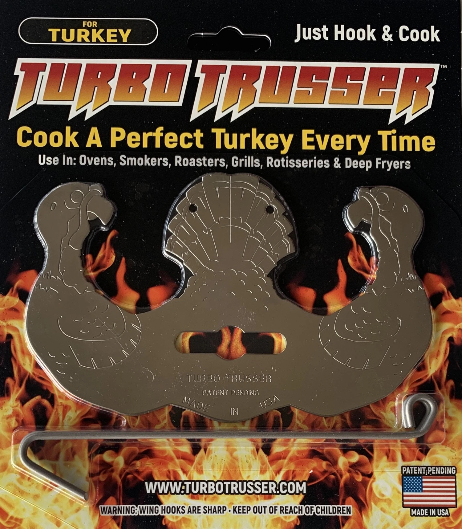 The Turbo Trusser is a rapid trussing device for use with whole Turkey’s. Just Hook & Cook for a perfect bird every time. Use in Ovens, Smokers, Grills, Roasters, Rotisserie’s and Deep Fryers. Stainless Steel : Dishwasher Safe