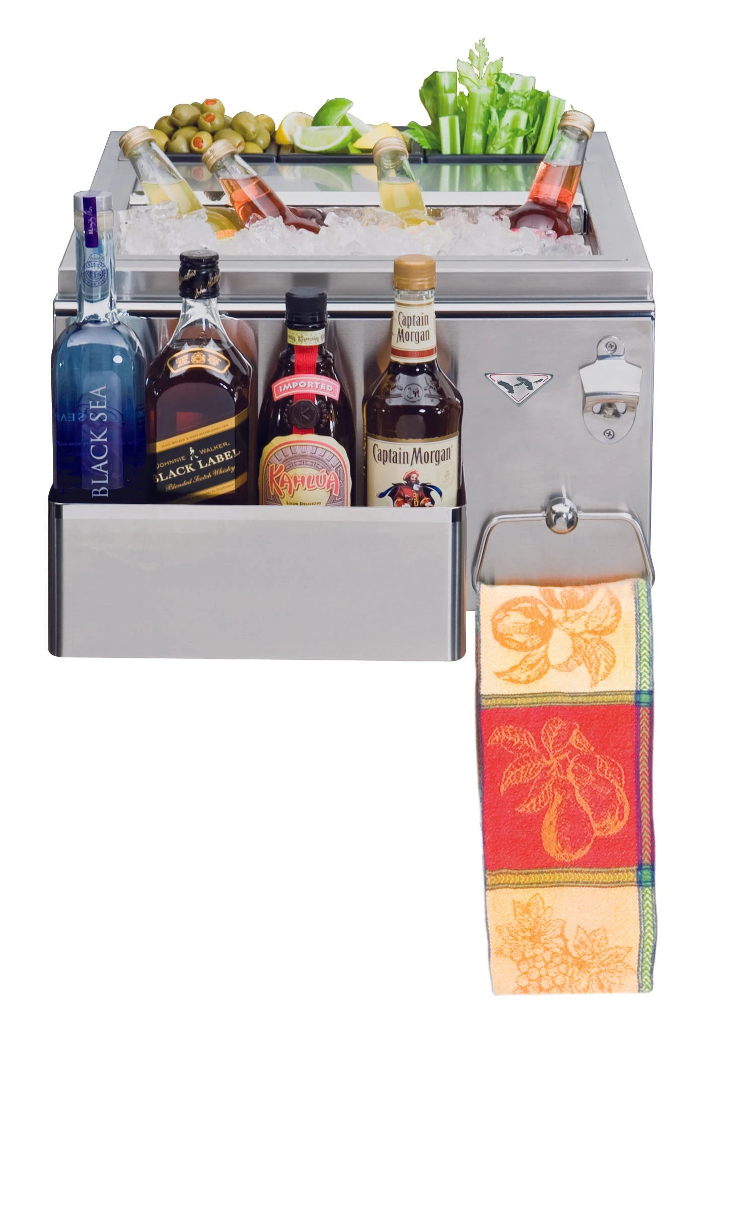 This compact beverage center features an insulated ice compartment that holds up to 40 pounds of ice and three cooling compartments to keep beverages on ice and condiments fresh. Excellent for outdoor entertaining.